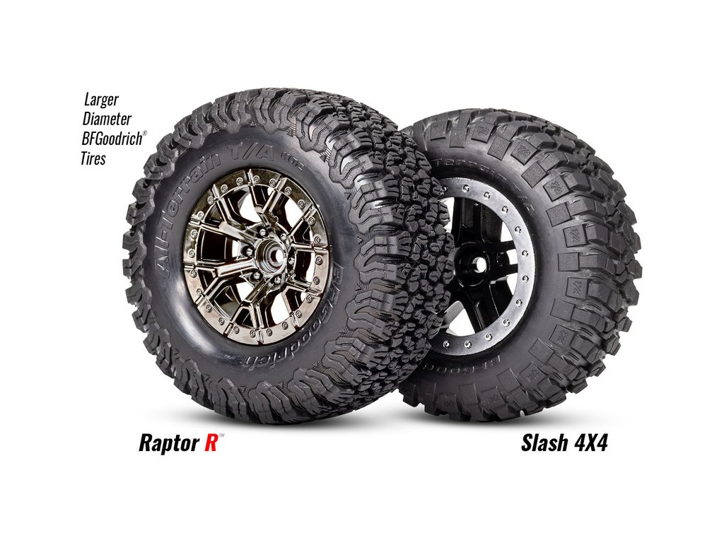 Licencované pneumatiky BFGoodrich All-Terrain T/A KO2 jsou o 5 mm vyšší než standardní pneumatiky na modelu Slash, aby napodobily vzhled a agresivní postoje Raptoru R. Replika kol Ford s imitací Beadlock má stejný vnější průměr 2,2″ a vnitřní průměr 3″ jako běžná kola pro modely Short Course. Unašeč je šestihran 12 mm.