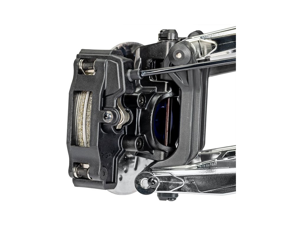 Výkonné přední kotoučové brzdy spolupracují se zadním brzděním pomocí motoru a zajišťují silný a kontrolovaný brzdný výkon na všech čtyřech kolech. Brzdové destičky v třemenech svírají nerezový kotouč, který je pro maketový vzhled opatřen chladícími otvory. Brzdy jsou ovládány servem přes bowdeny.