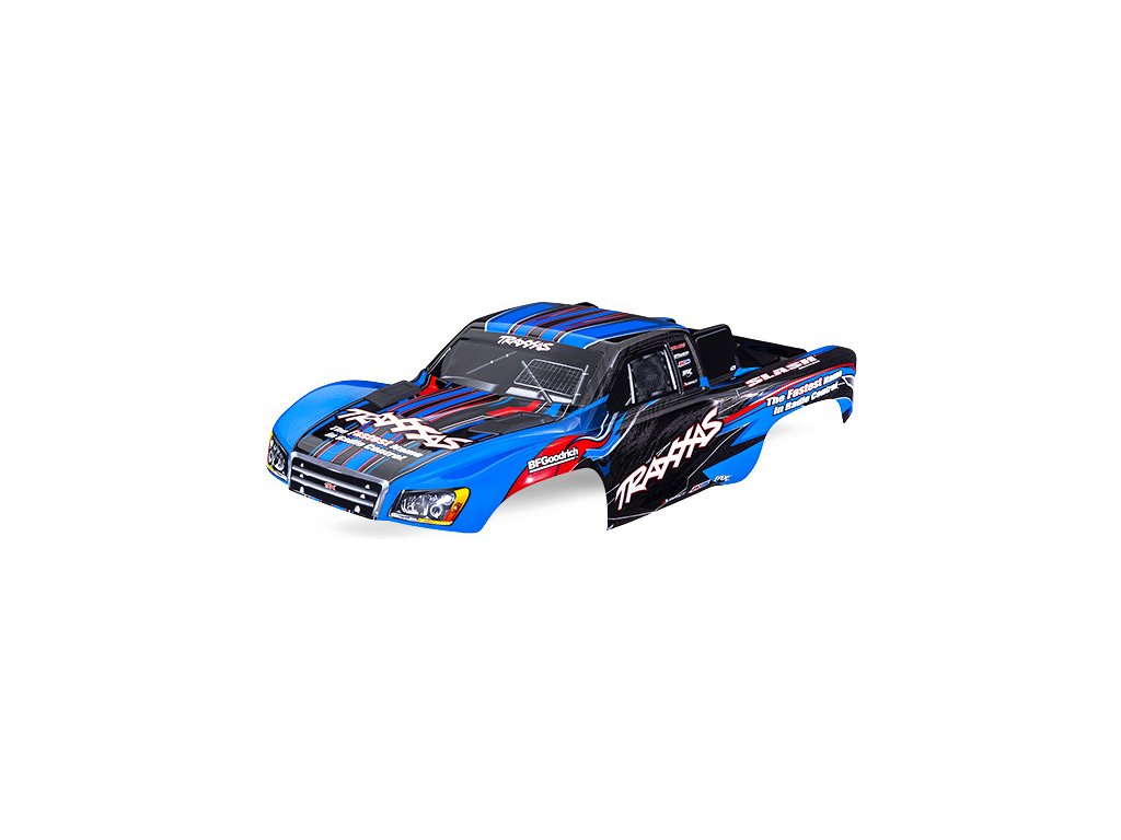 Náhradní díl pro RC modely aut Traxxas Slash 2WD, VXL nebo 4x4: karosérie modrá bezsponková. Hotové zbarvení ProGraphix® s předem aplikovanými obtisky. Smontovaná karosérie s předními a zadními bezsponovými západkami.
