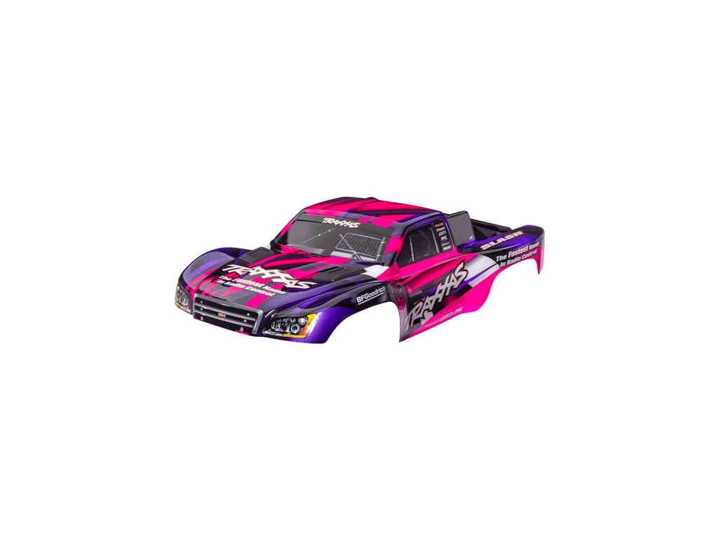 Traxxas karosérie Slash 2WD růžová (bezsponková) (také vhodná pro Slash VXL a Slash 4x4). Nabarvená, sestavená karoserie, včetně bezsponkového držáku pro upevnění. Pro starší šasi Slash se sponkovým systémem upínaní karoserie je vyžadován díl #6940 (Slash 2WD), nebo díly #6976 a #10125 (Slash 4x4).