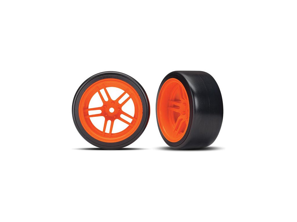 Kompletní zadní kola pro RC modely auta Traxxas 4-Tec 2.0. Oranžové disky Split-spoke s pneumatikami Drift (2 ks v balení).