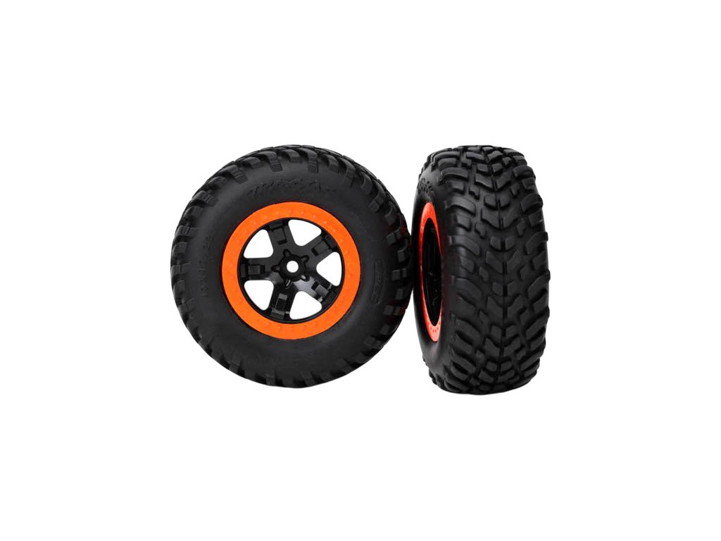 Kompletní zadní kola pro 2WD, přední i zadní pro 4WD auta Traxxas Slash. Černé disky s oranžovými ráfky nalepenými pneumatikami SCT a vložkou. Rozměr disku 61/81x42 mm.