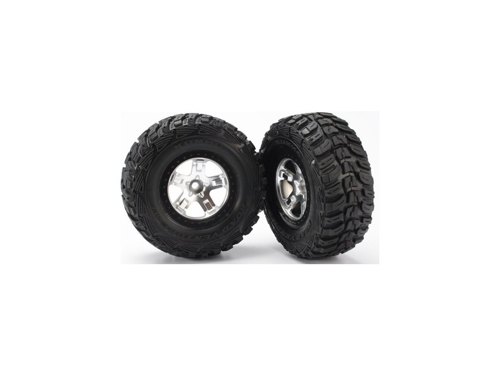 Kompletní přední kola pro 2WD auta Traxxas Slash. Saténové disky s černými ráfky Bead Lock s nalepenými pneumatikami Kumho (měkká směs) a vložkou.