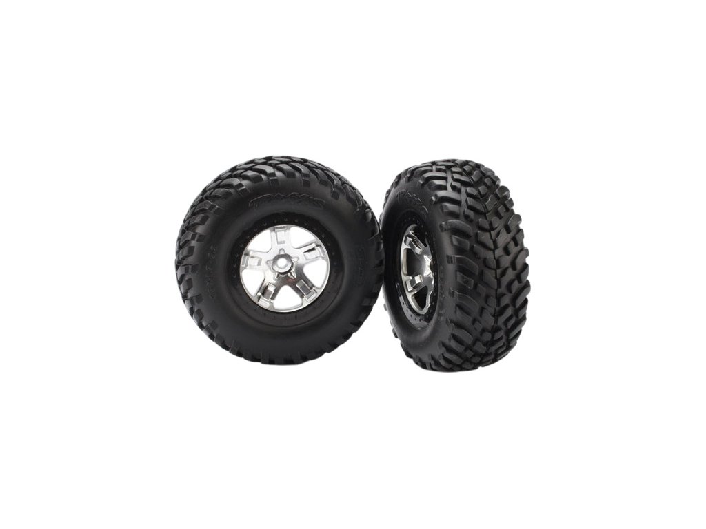 Kompletní zadní kola pro 2WD, přední i zadní pro 4WD auta Traxxas Slash. Stříbrné disky s černými ráfky a nalepenými pneumatikami Off-Road s vložkou