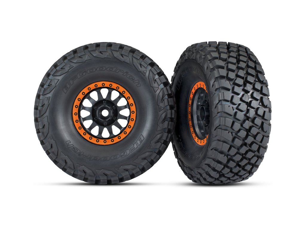 Kompletní univerzální kola pro Traxxas Unlimited Desert Racer. Disky Method Racing v černém provedení s oranžovými ráfky a pneumatikami Baja KR3 (2 ks v balení).