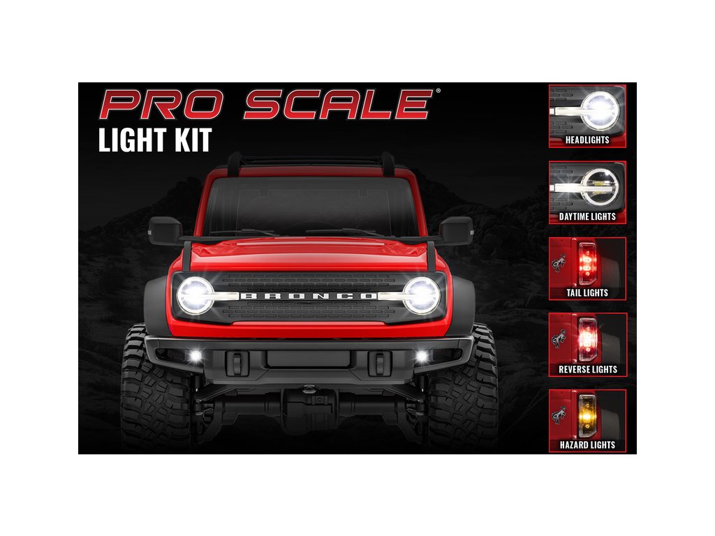 Sada osvětlení ProScale přidává k modelu TRX-4M Ford Bronco 2021 přední světlomety, koncová světla, funkční brzdová a zpátečková světla, výstražná světla. Instalace je velmi jednoduchá. Stačí upevnit světla a zapojit je do řídící jednotky ECM-2.5, která je již předprogramovaná. Pro maximální jednoduchost jsou světla spojena jediným kabelovým svazkem se sběrnicí. Jako zbytek modelu je i toto osvětlení koncipováno jako voděodolné*.