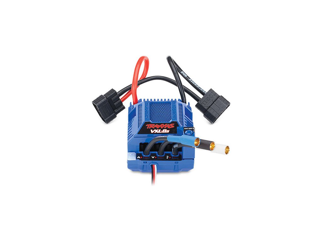 Náhradní díl pro RC model auta Traxxas XRT - střídavý regulátorem VXL-8S (T). Vstupním napětí 4, 6 nebo 8 čl. LiPo (max. 33.6 V). Jednoduché nastavení jedním tlačítkem. Indikace stavu LED diodami. Odvod tepla pomocí masivního chladiče a ventilátoru. Voděodolná* konstrukce. Zlacené konektory 6.5mm. 2-stupňová detekce nízkého napětí LiPol akumulátorů, tepelná ochrana a přepěťová ochrana.