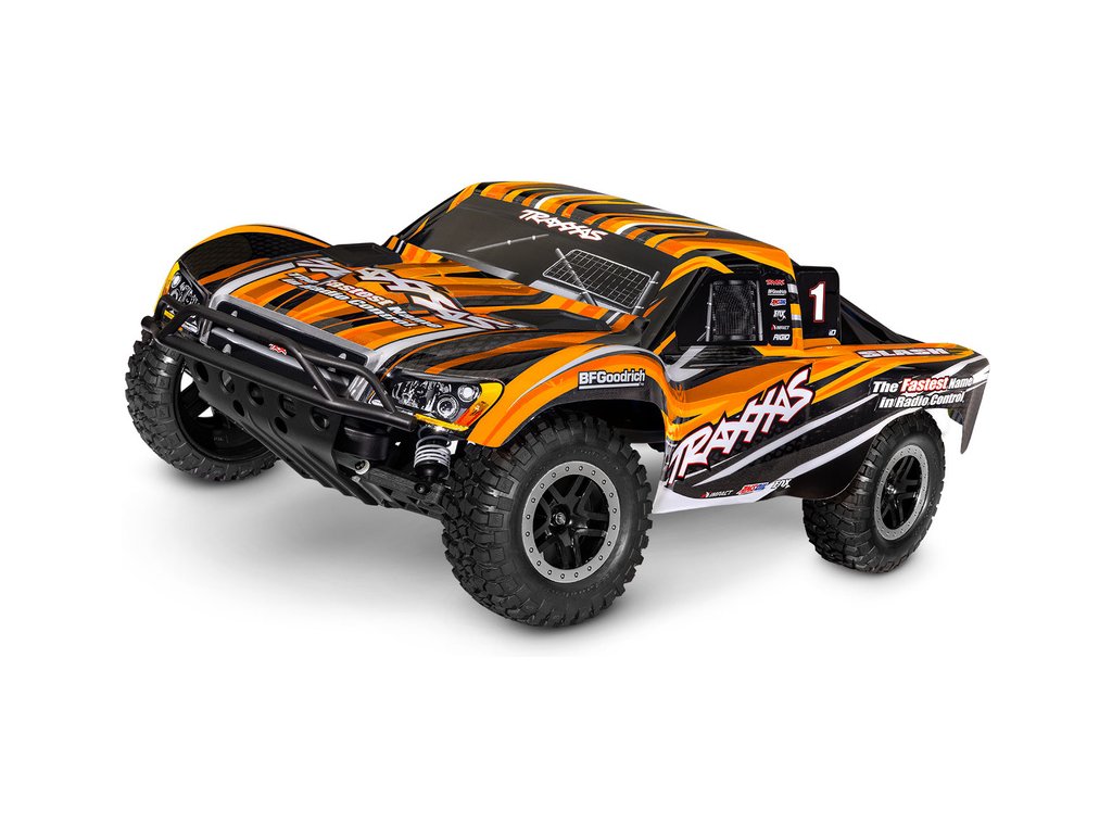 Traxxas Slash je RC model auta 1:10 s náhonem 2WD, který jezdí rychlostí až 48 km/h. Je plně sestaven a připraven k jízdě ihned po vybalení z krabice. Pohání jej výkonný stejnosměrný motor Titan 550 12T s regulátorem XL-5. Jednoduchá RC souprava Traxxas TQ 2.4 GHz poskytuje precizní mechaniku pro přesné řízení. Obsažen je NiMH akumulátor a moderní USB-C nabíječ pro bezpečný a bezstarostný provoz. Nově je na modelu použitý bezsponkový systém uchycení karoserie pro snadnou výměnu baterie a továrně jsou instalovány prvky zavěšení Extreme Heavy Duty pro vysokou odolnost.