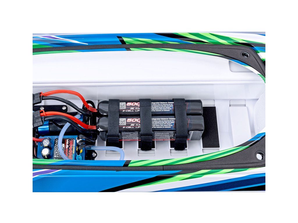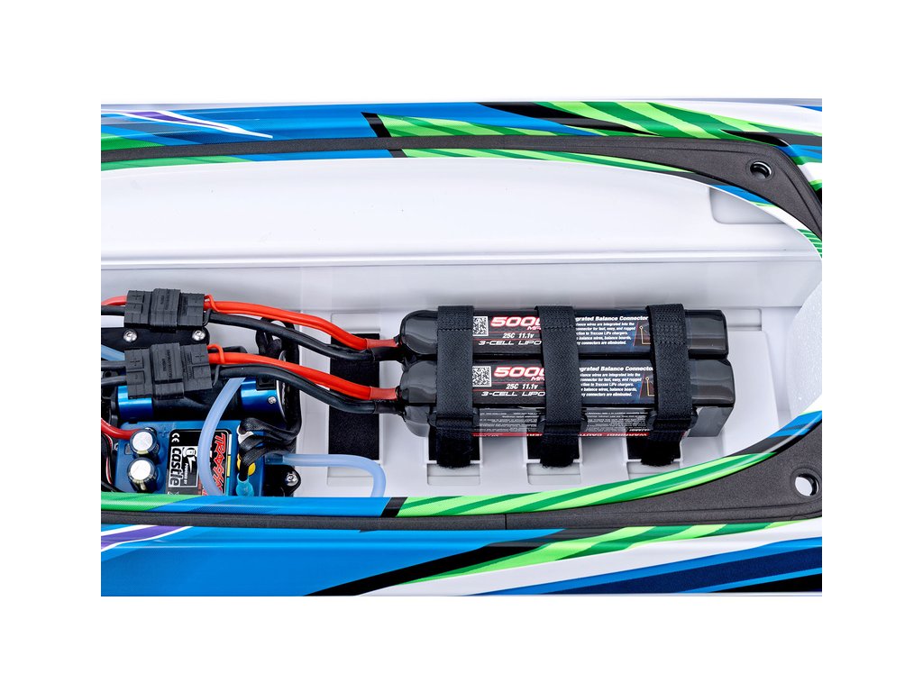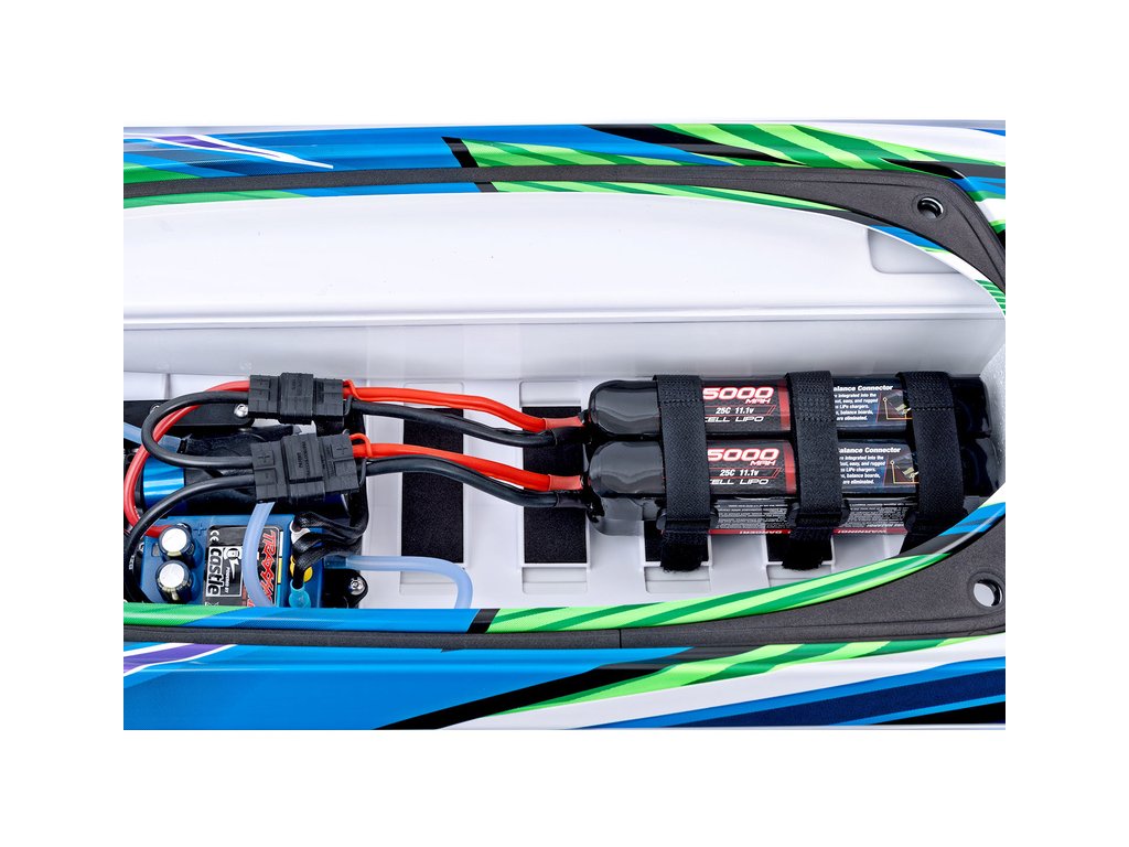 Pro napájení je doporučeno použít dvojici stejných LiPol akumulátorů 2S nebo 3S, které se zapojují do série 4S nebo 6S. Konektory na regulátoru zajistí správné připojení. Do prostoru v trupu lodi jsou doporučeny buď dvoučlánky 5000mAh / 7600mAh nebo tříčlánky 5000mAh.
