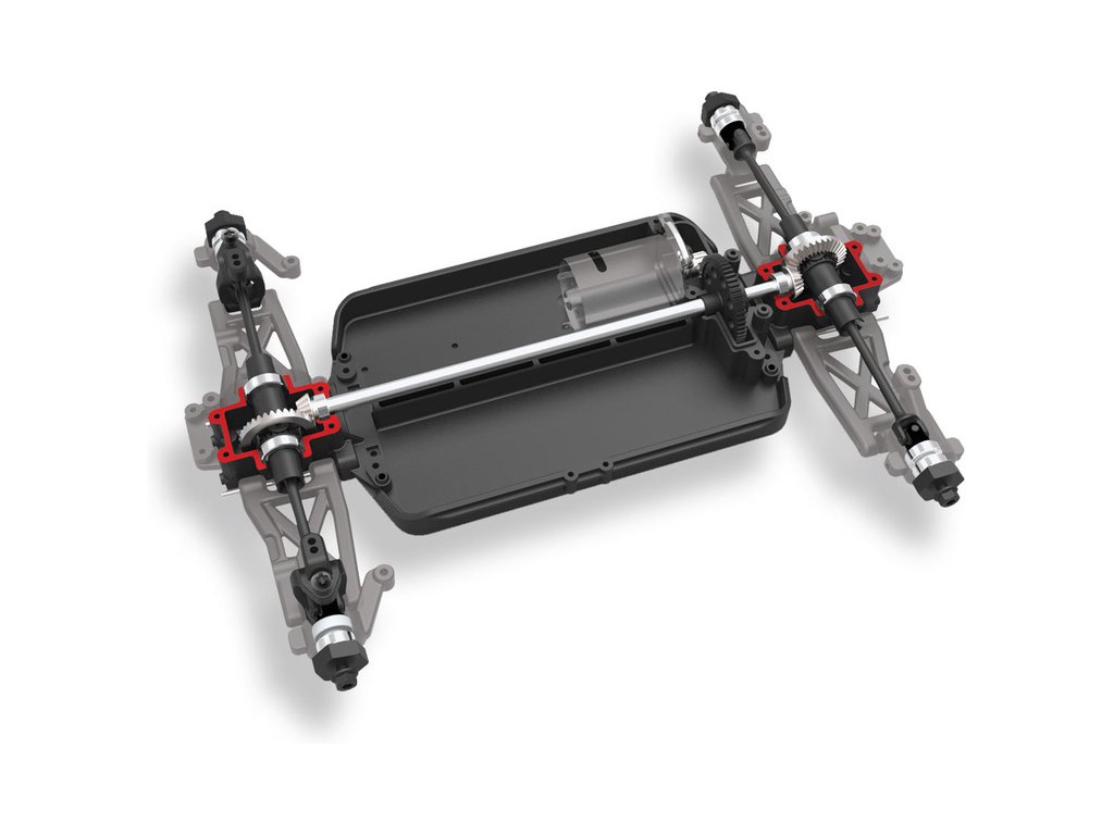Stejně jako u skutečných aut i u tohoto RC modelu je použit přední diferenciál, který rozděluje točivý moment mezi kola a dovoluje rozdílné otáčky na předních kolech při průjezdu zatáčkou. Tím je jízda plynulá a autíčko má výborné jízdní vlastnosti. Pro perfektní distribuci výkonu je model vybaven i zadním diferenciálem. Dlouhou životnost zaručují kovové převody.