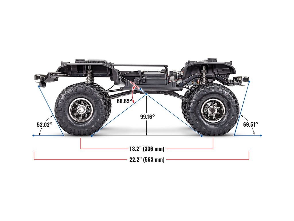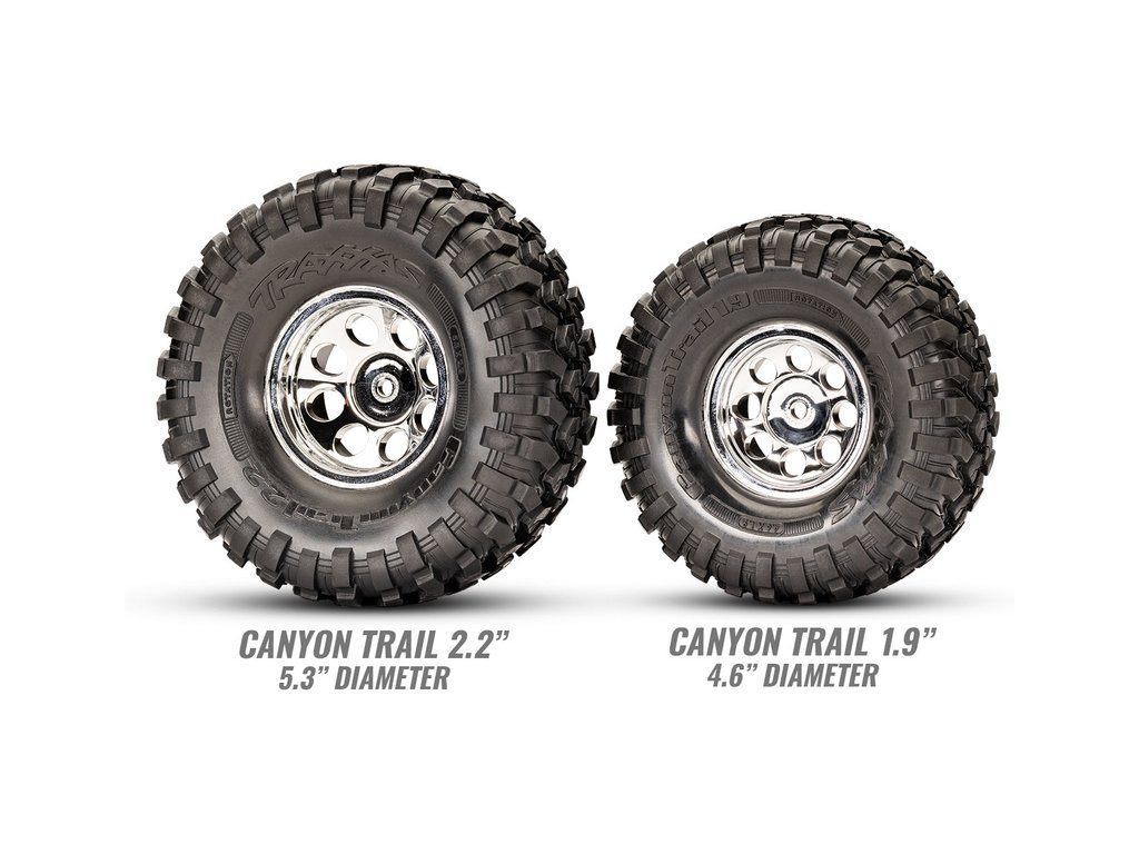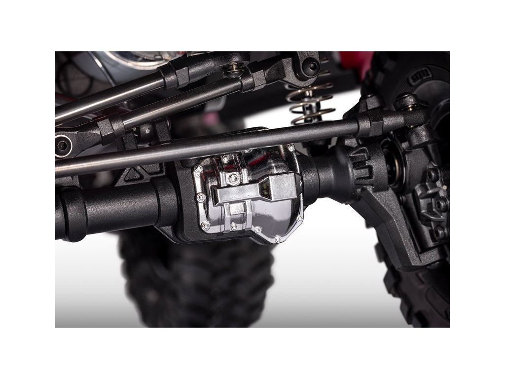 Továrně instalovaná sada Long Arm Lift kit zvyšuje světlou výšku o 2.5 cm. To umožnilo použití větších kol 2.2” s pneumatikami Canyon Trail. S tímto vybavením bude RC model v terénu nepřekonatelný.