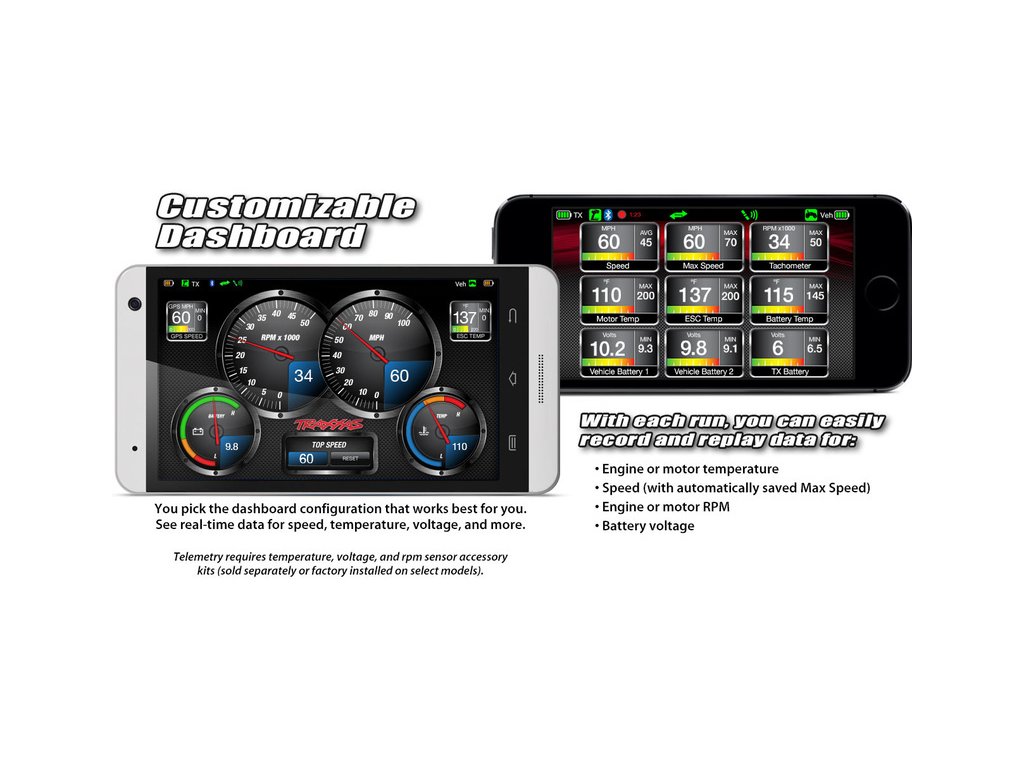 Traxxas Link shromažďuje a zaznamenává telemetrická data v reálném čase během jízdy. Když nainstalujete na svůj model volitelné telemetrické senzory, palubní deska Traxxas Link přichází k životu a zobrazuje rychlost, napětí baterie, otáčky a teplotu. Aplikace automaticky detekuje a rozpoznává senzory Traxxas Link a nastaví je. Palubní deska může zobrazovat buď číselné, nebo digitální přístroje. Až devět přístrojů lze zobrazit najednou. Nastavit lze prahové hodnoty varování, maxima, minima, nebo průměry. Použijte funkci nahrávání a zdokumentujte váš pohled na palubní desku, zvuk, takže se můžete dívat na vaše auto. Jestliže jste zapomněl nahrávat, jednoduše stiskněte Instant Replay a můžete si zobrazit nahrávku za poslední minutu. Nahrávky mohou být pojmenovány a uloženy k porovnání, recenzi nebo sdílení s přáteli.