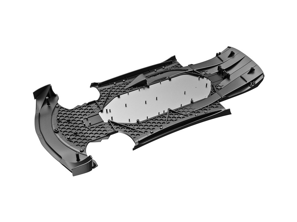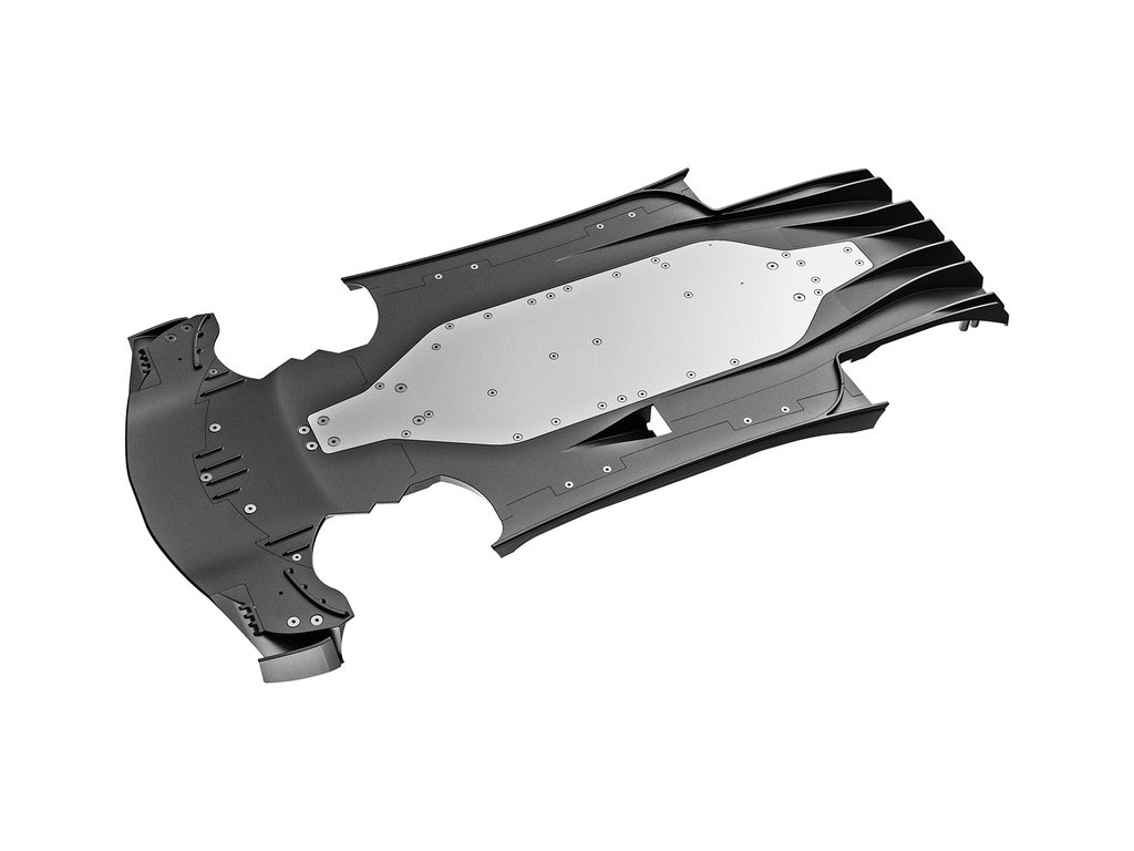 Šasi modelu tvoří extrémně pevná podvozková deska, vyrobená z hliníku 6061-T6 o tloušťce 3 mm. Podvozek je ze spodní strany naprosto rovný a jsou na něho přidělány plastové aerodynamické díly. Komponenty elektroniky a baterie jsou uloženy na podvozku uprostřed v ose modelu, čímž je zajištěno přesné vyvážení modelu a nízké těžiště. Díky tomu má RC model auta výborné jízdní vlastnosti.
