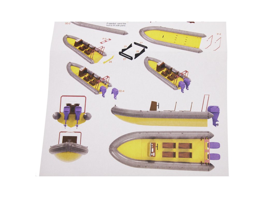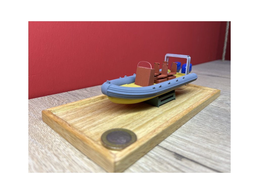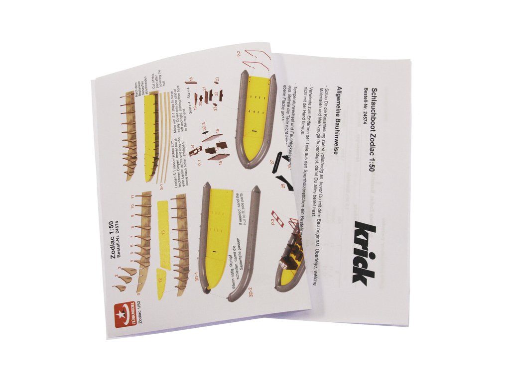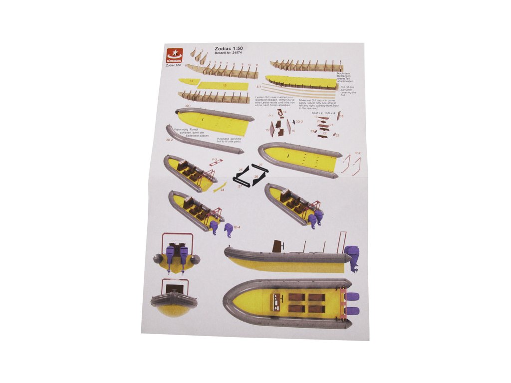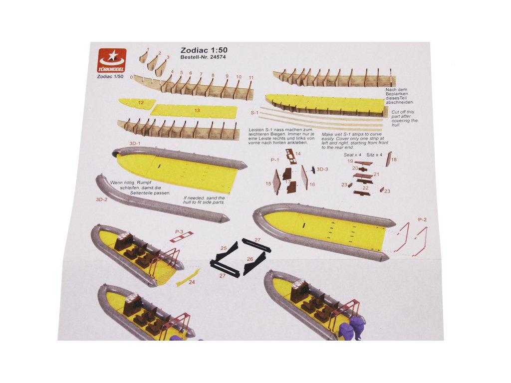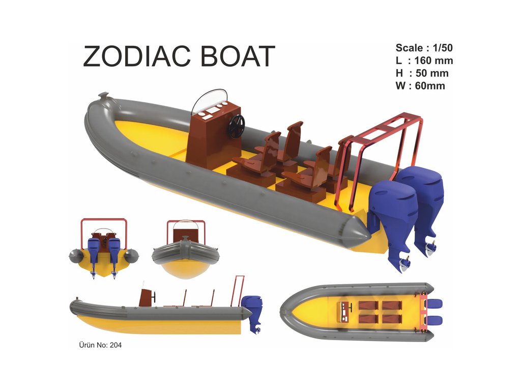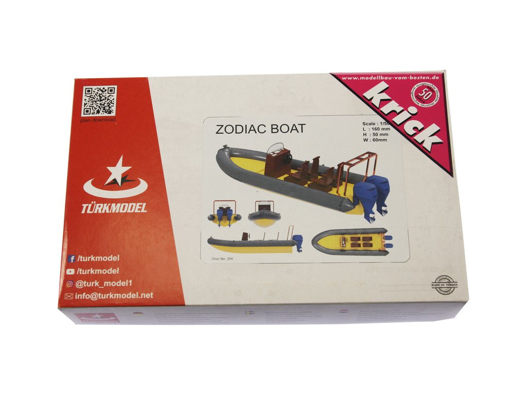 Stavebnice modelu lodi Türkmodel plovákový člun Zodiac v měřítku 1:50. Délka modelu lodi je 160mm, stavba převážně ze dřeva, 3D tištěné detailní resinové doplňky, součástí je i stavební plán. Obrazový manuál krok za krokem.