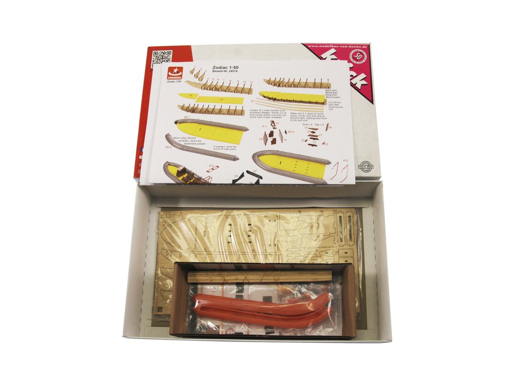 Balení Türkmodel Zodiac nafukovací člun 1:50 kit obsahuje sady překližkových laserem vyřezaných dílů, sáčky s drobnými díly, sadu výkresů a vícejazyčný manuál.