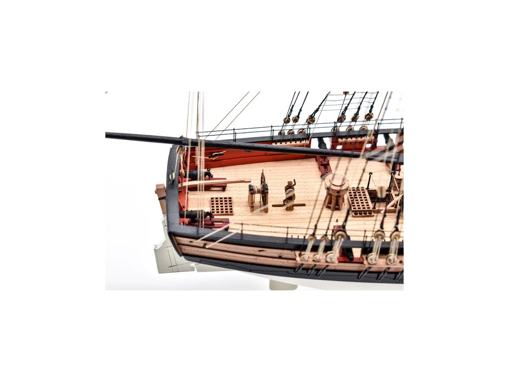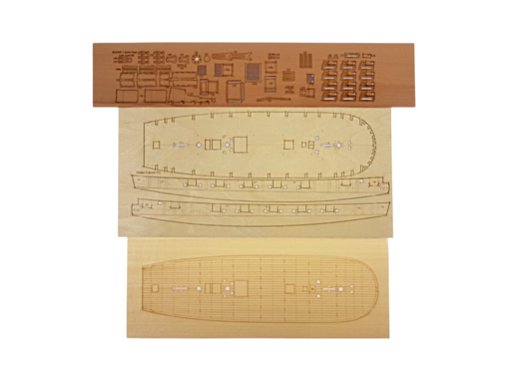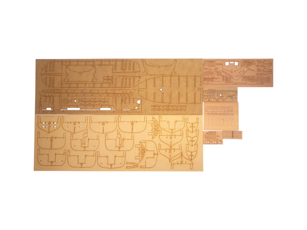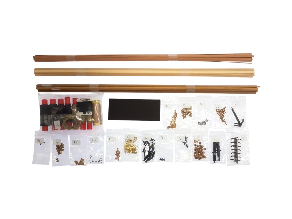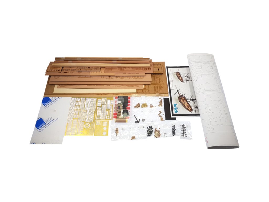 Balení obsahuje laserem řezané dřevěné a plastové díly, plaňky, lišty, paluby, stožáry, dekorace, 3x mosazné fotolepy, lanoví, 3D tištěné díly. Podrobný obrázkový manuál EN a stavební plány.