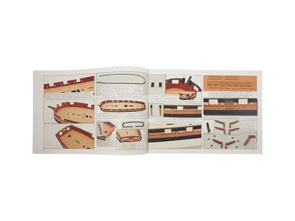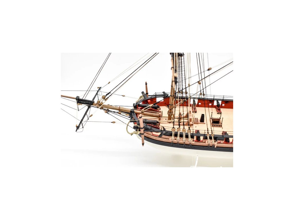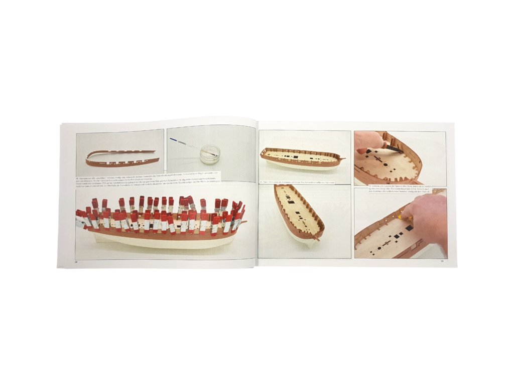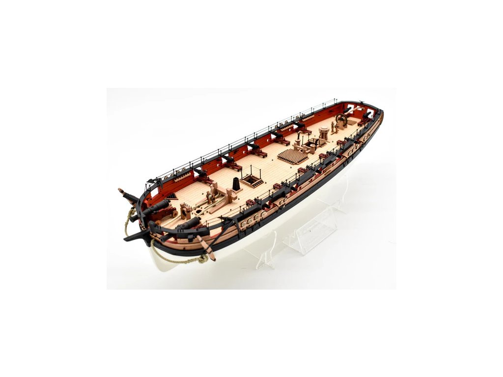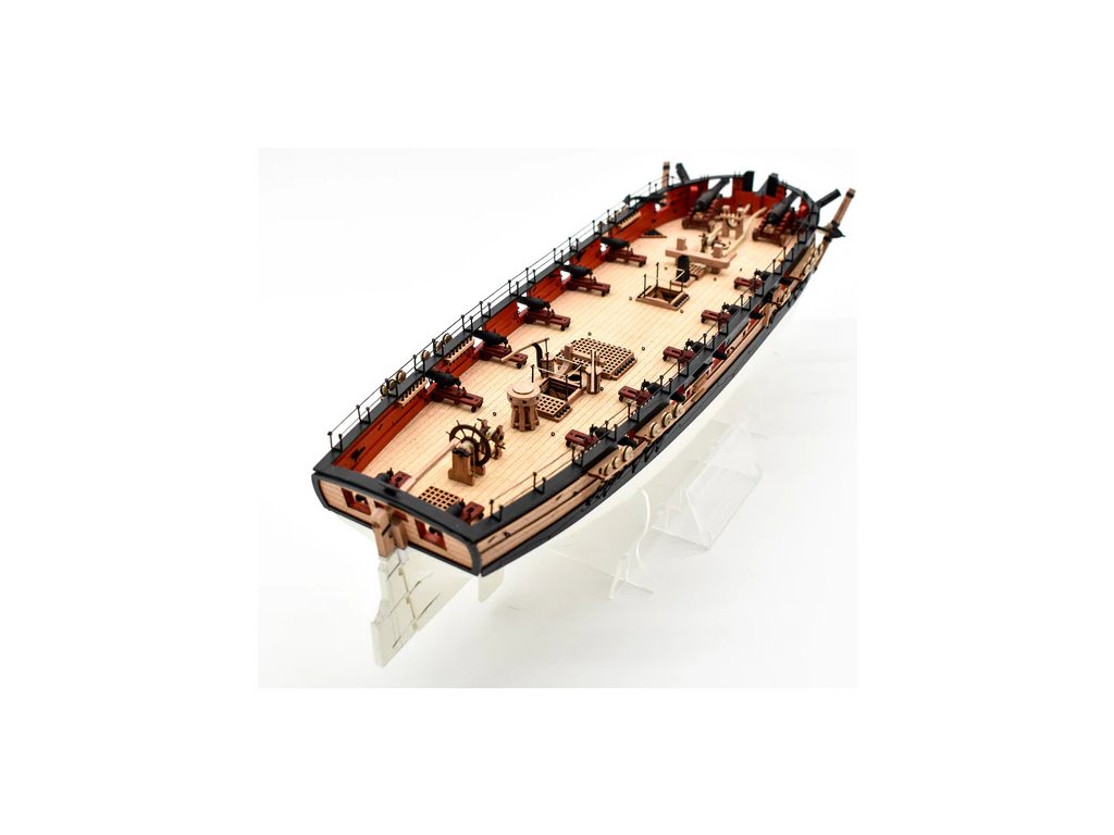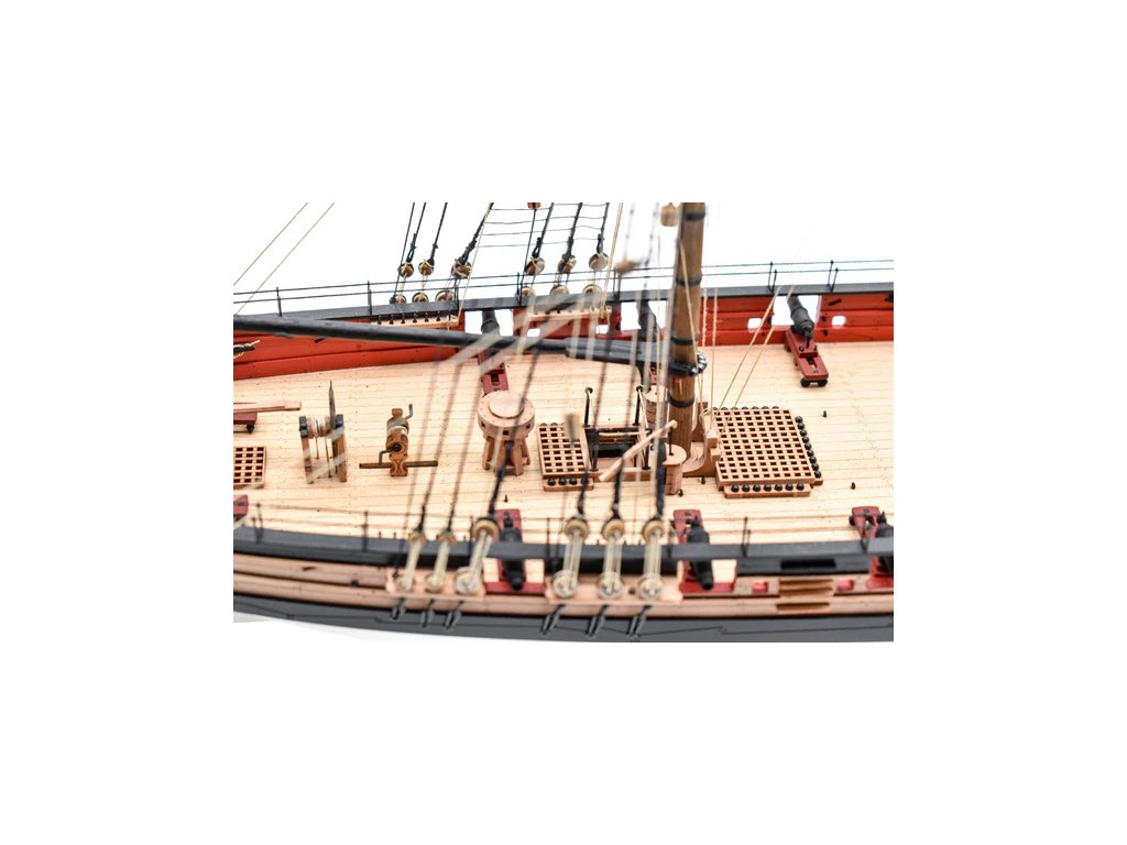 Balení obsahuje laserem řezané dřevěné a plastové díly, plaňky, lišty, paluby, stožáry, dekorace, 3x mosazné fotolepy, lanoví, 3D tištěné díly. Podrobný obrázkový manuál EN a stavební plány.
