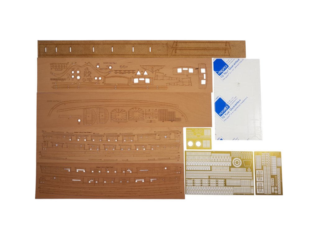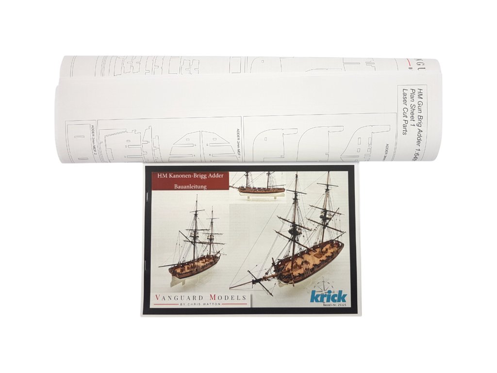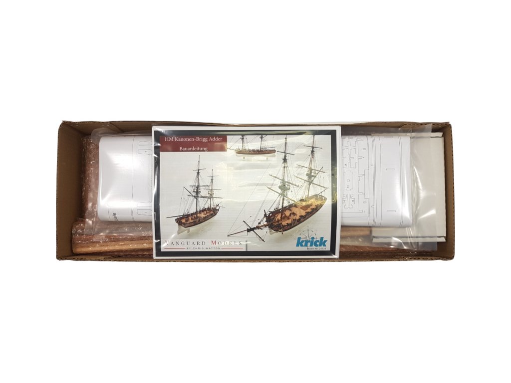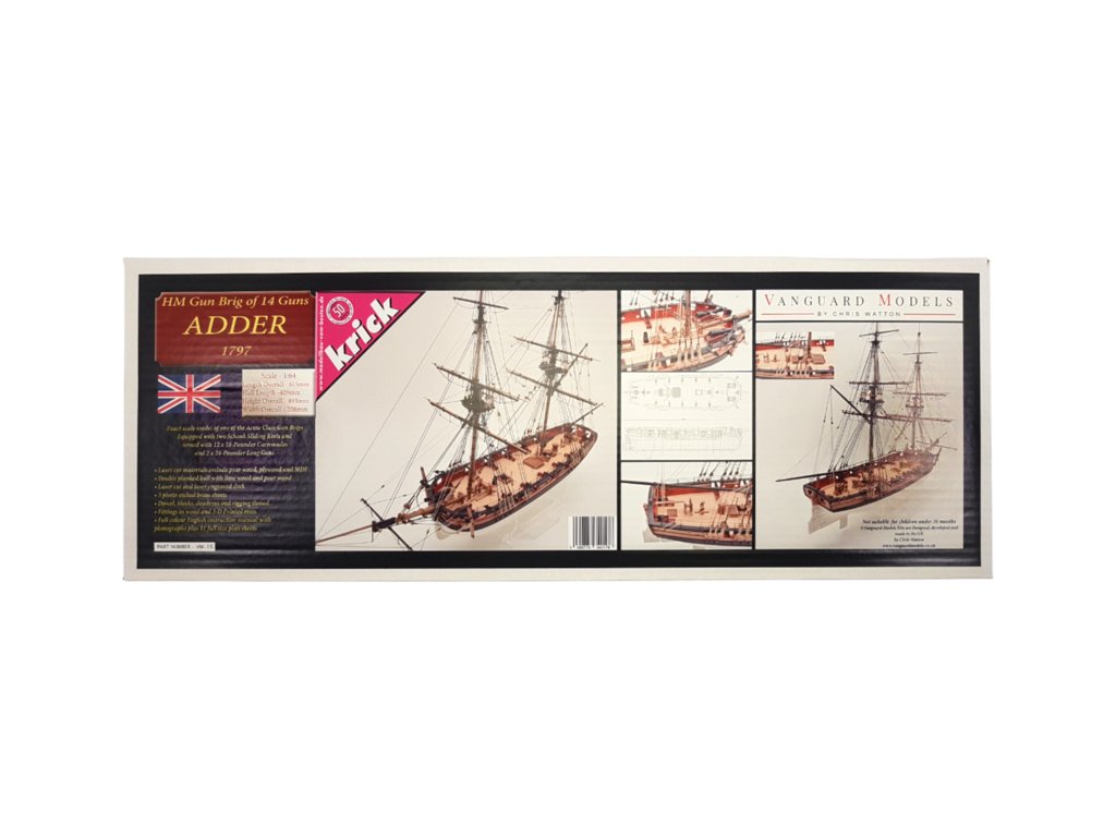 Stavebnice neplovoucího modelu historické plachetní lodi HM Adder z roku 1797, v měřítku 1:64, od Vanguard Models. Loď představuje typickou konstrukci tehdejších ozbrojených lodí s bohatými detaily. Stavba je převážně ze dřeva, díly jsou přesně laserem řezané, plaňkování je dvouvrstvé z lipového a hruškového dřeva, detaily jsou dřevěné, mosazné fotoleptané, nebo také z 3D tisku. Velkou výhodou stavebnice je detailní obrázkový manuál krok po kroku a podrobné výkresy v měřítku.