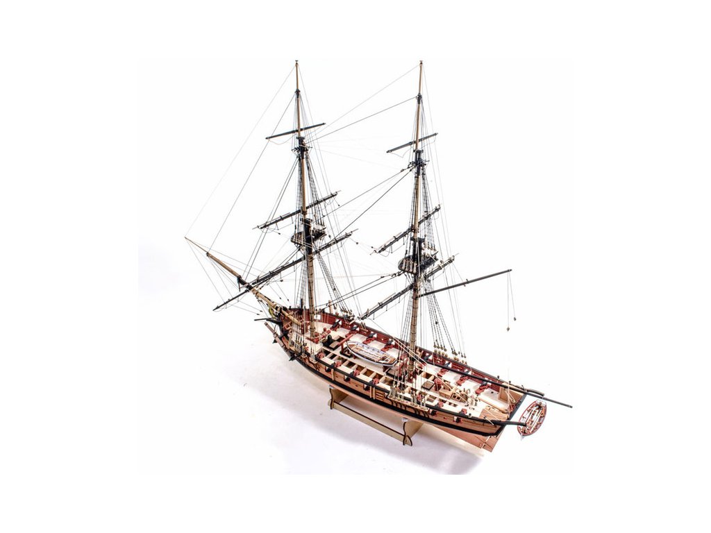 Laserem vyřezané díly z hruškového dřeva, překližky a MDF, dvojitá obšívka trupu z lípy a hruškového dřeva, měděná obšívka pod čarou ponoru součástí stavebnice, ořechové kladky v měřítku, laserem gravírovaná paluba s naznačenými spárami a imitací dřevěných kolíků, 3 archy leptané mosazi, stěžně, kladky, oka, napínáky a lanoví, doplňky ze dřeva a 3D tištěné části z pryskyřice, barevný anglický návod s fotografiemi, 16 výkresových listů v měřítku 1:1 na arších formátu A1.