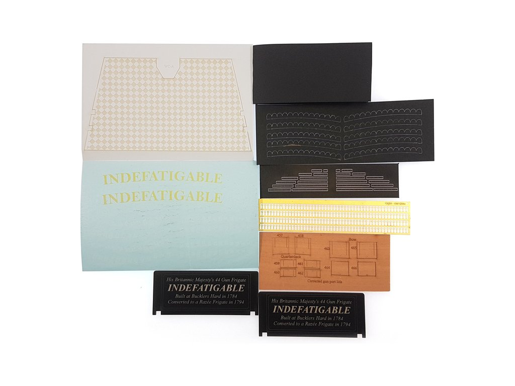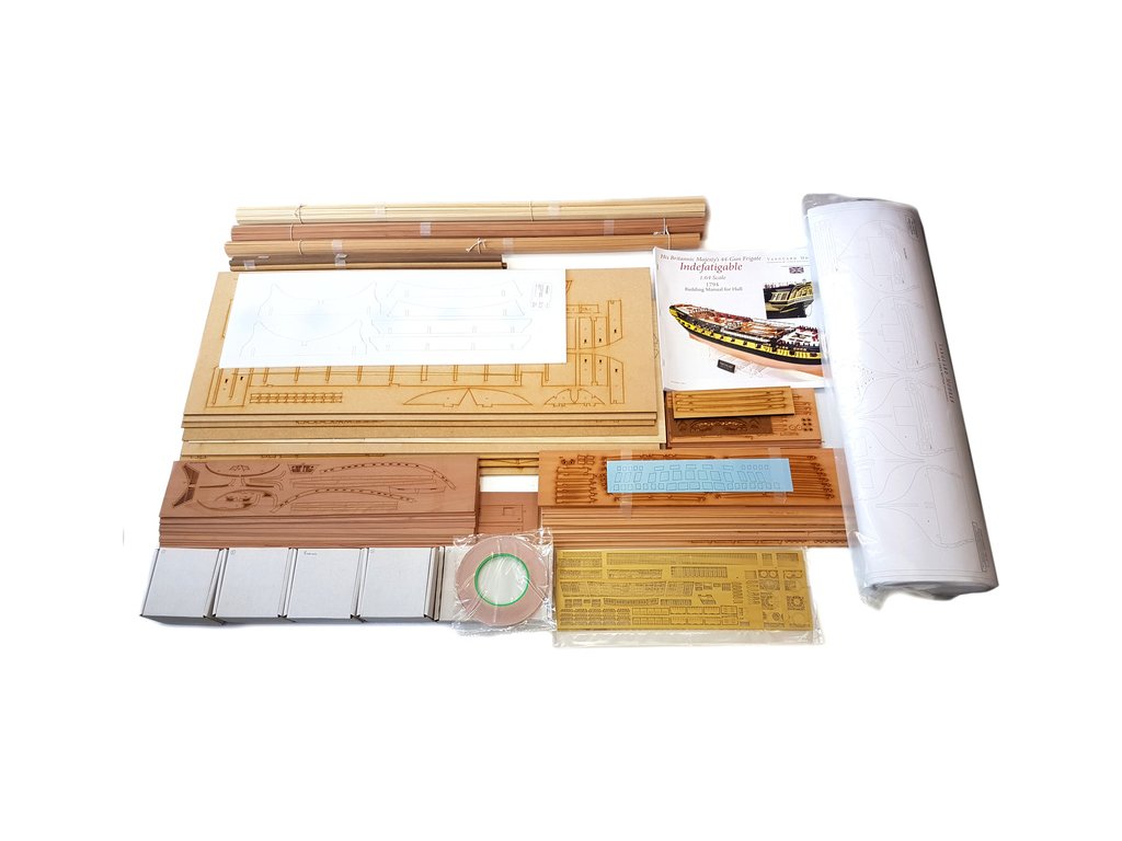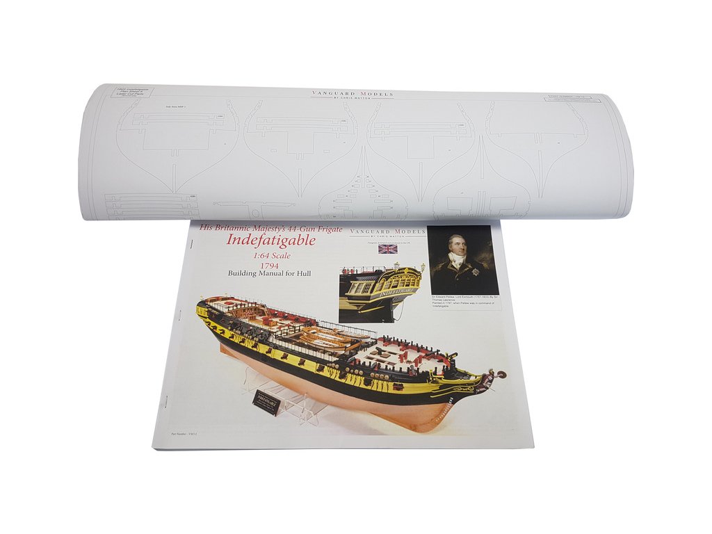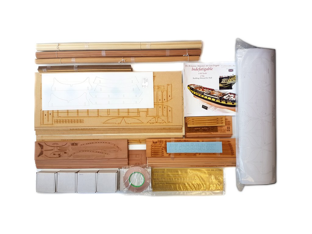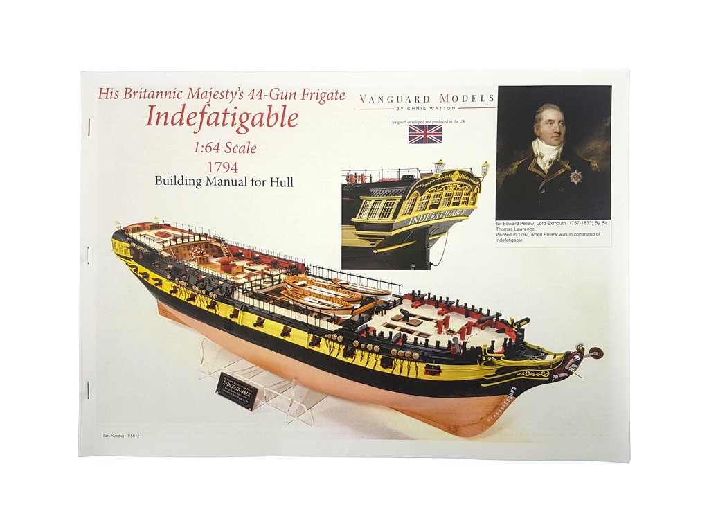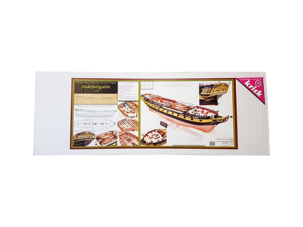 Stavebnice neplovoucí makety lodi od anguard Models, HMS Indefatigable z roku 1794, v měřítku 1:64. Pro zkušené modeláře. Dřevěný trup z laserem vyřezaných dílů, součástí je stavební plán, autentické detaily. Komplexní, barevný návod k použití
