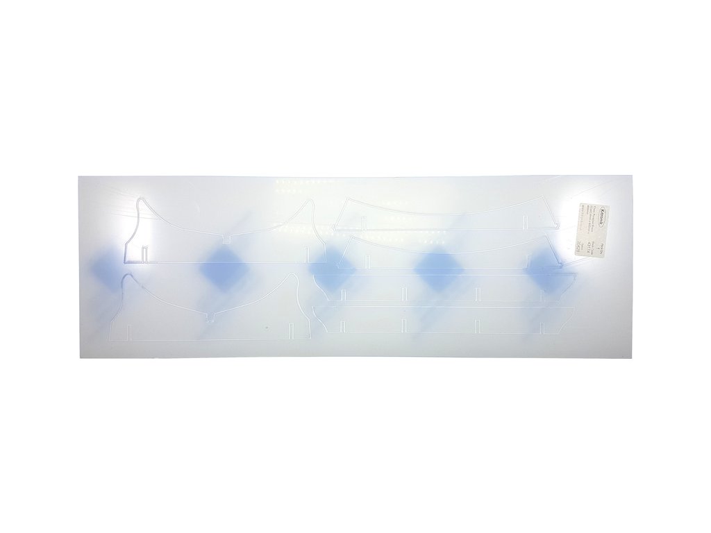 - Laserem řezané kusy z MDF a čirého acetátu pro okna galerie. Všechny viditelné části jsou vyřezány laserem z desek z hruškového dřeva