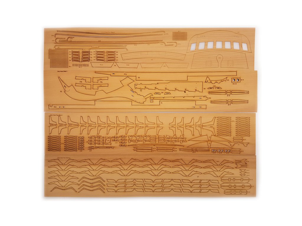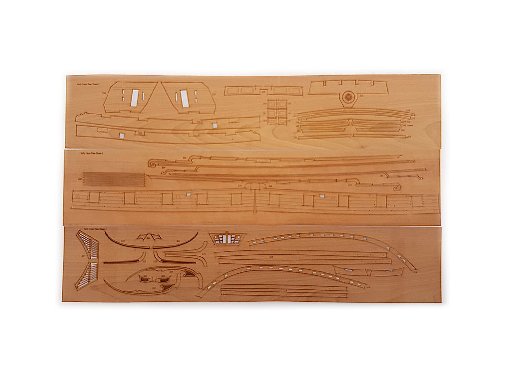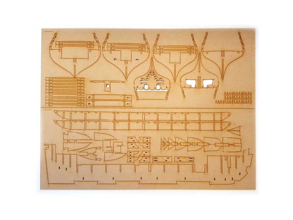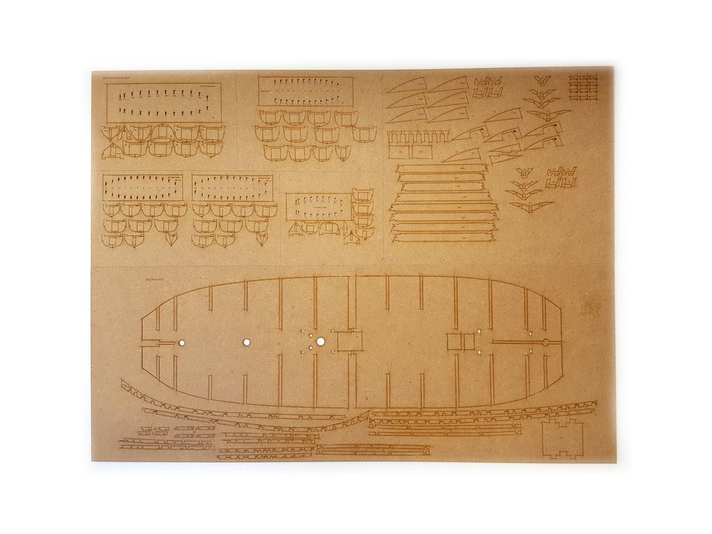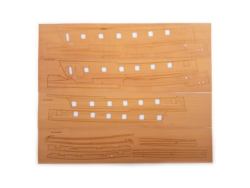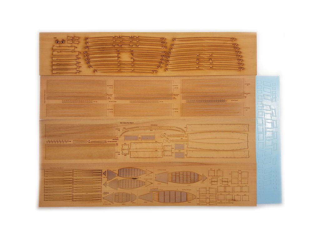 Balení obsahuje laserem řezané díly z překližky, plaňky, mosazné pláty z detaily, lana, plastové díly jako jsou děla židle a kotel. Podrobný obrázkový návod krok po kroku. Stavební plánky 1:1.