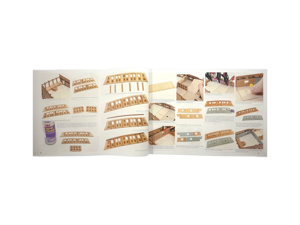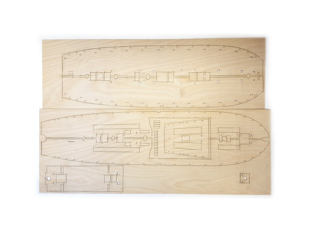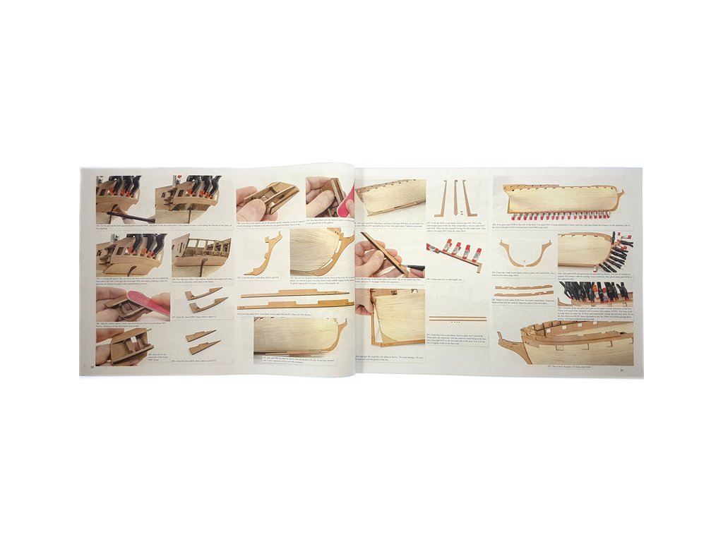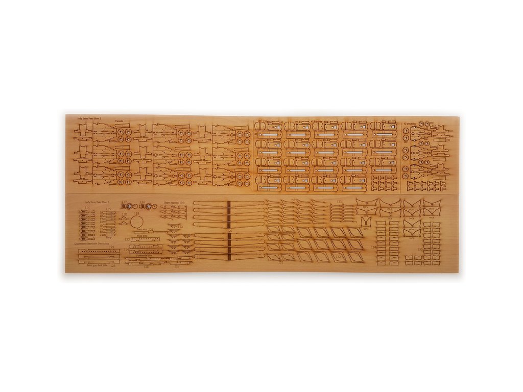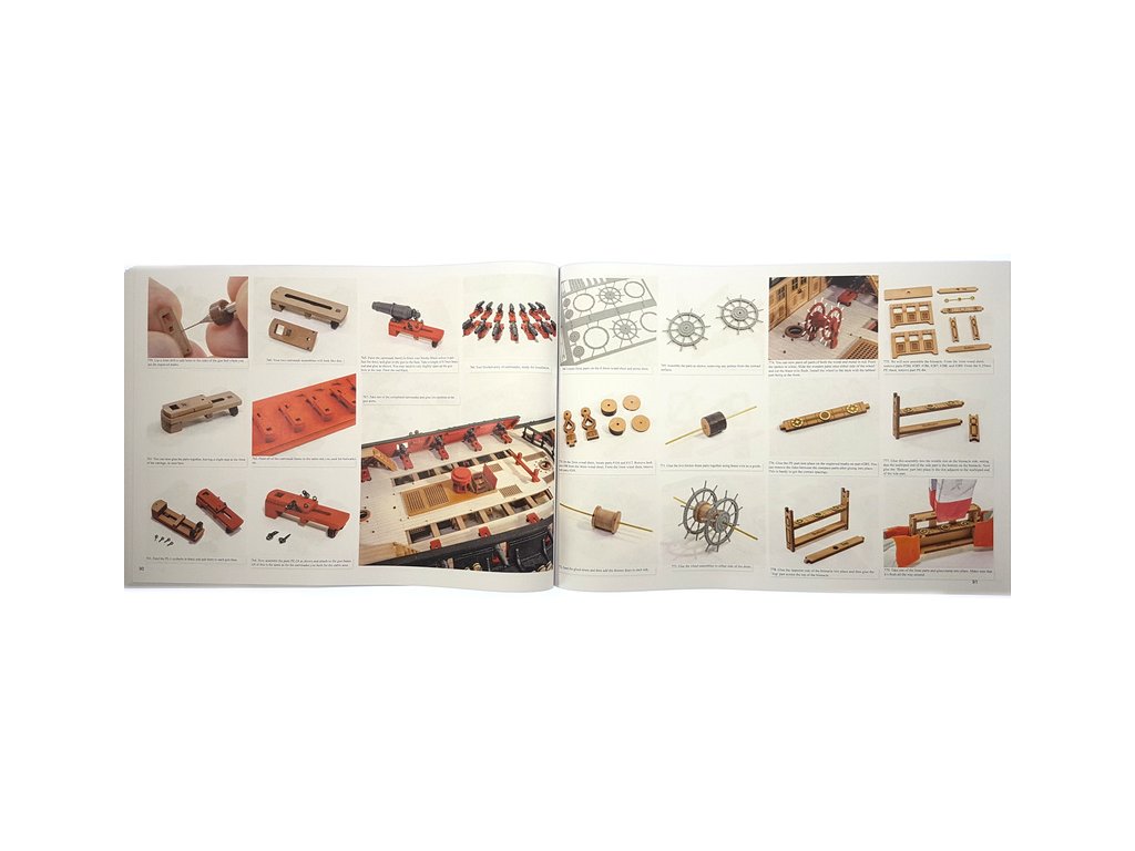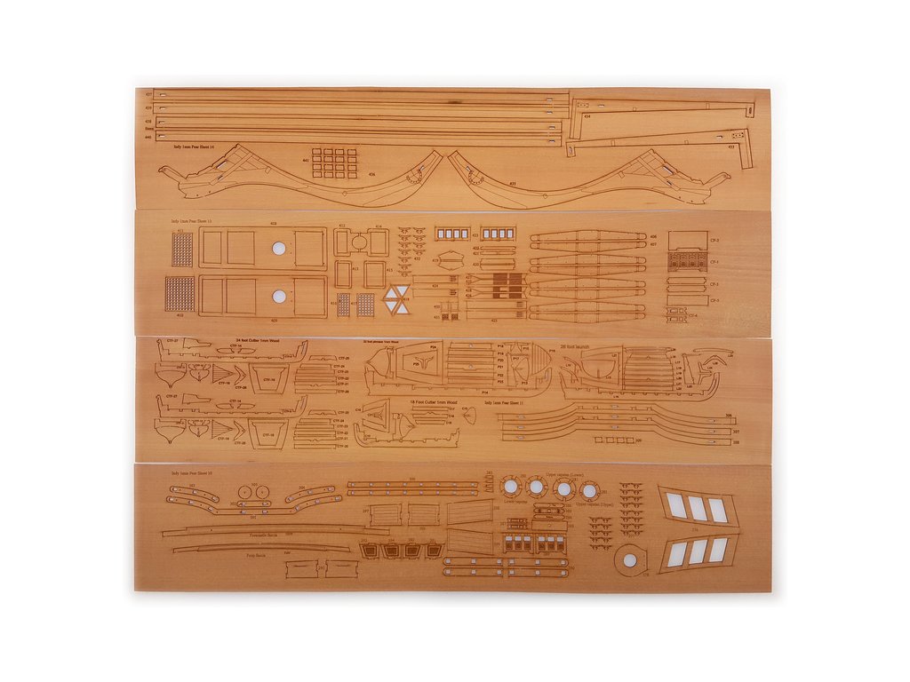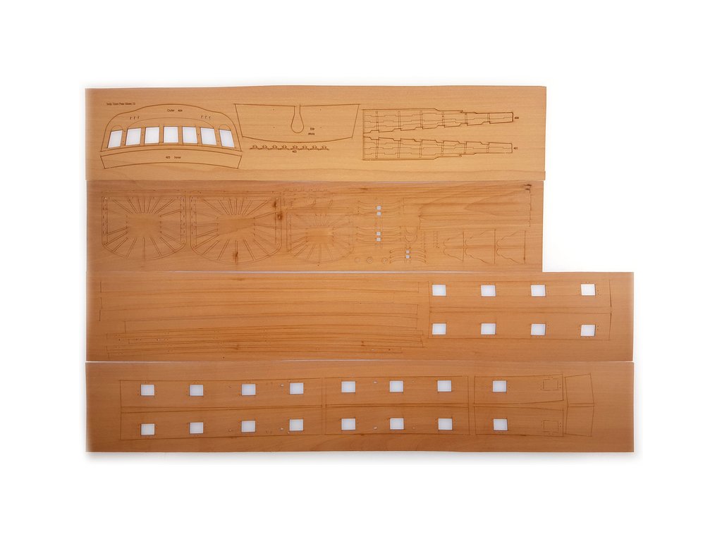 Balení obsahuje laserem řezané díly z překližky, plaňky, mosazné pláty z detaily, lana, plastové díly jako jsou děla židle a kotel. Podrobný obrázkový návod krok po kroku. Stavební plánky 1:1.