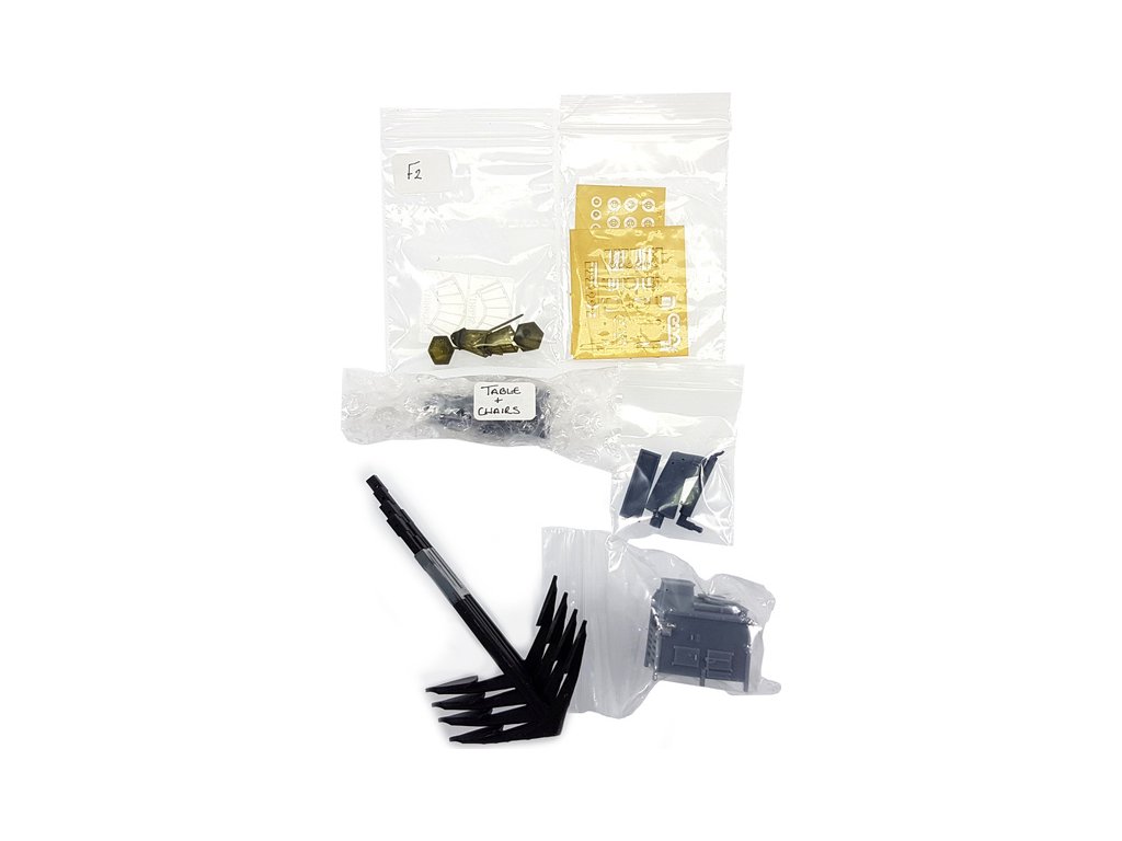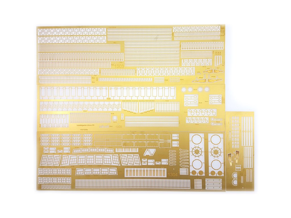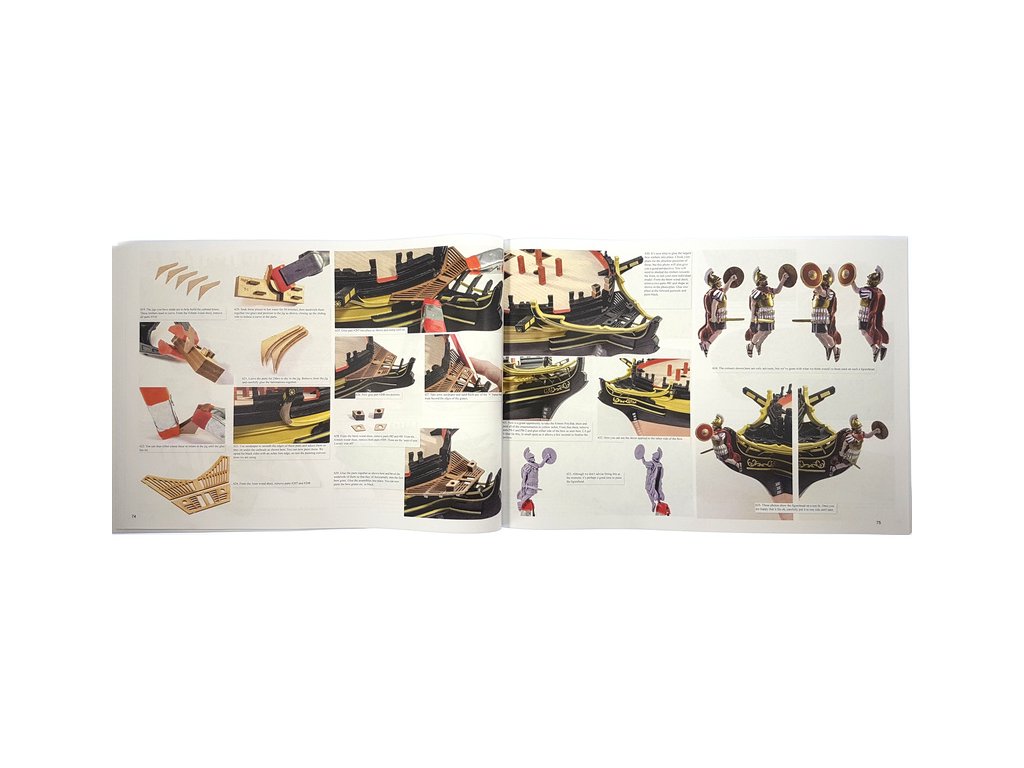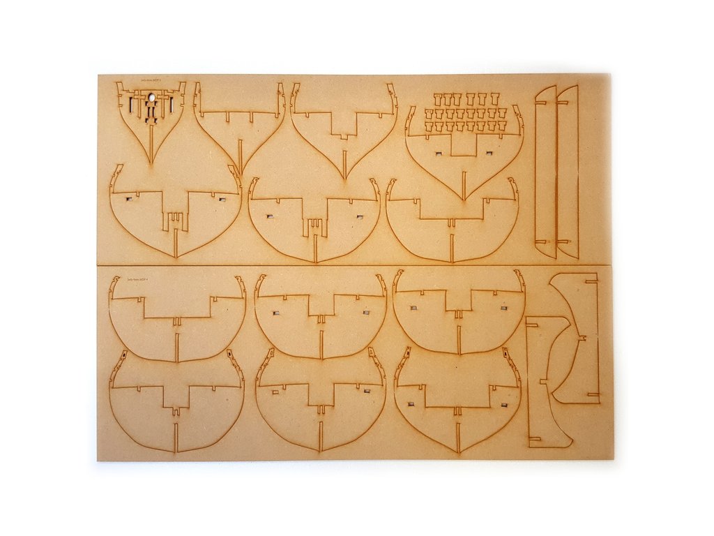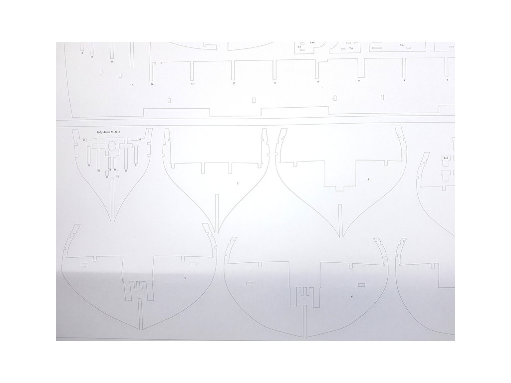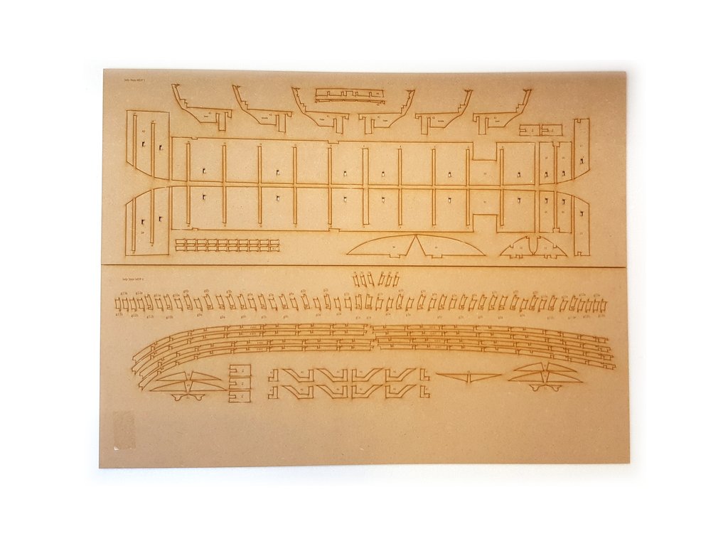Balení obsahuje laserem řezané díly z překližky, plaňky, mosazné pláty z detaily, lana, plastové díly jako jsou děla židle a kotel. Podrobný obrázkový návod krok po kroku. Stavební plánky 1:1.