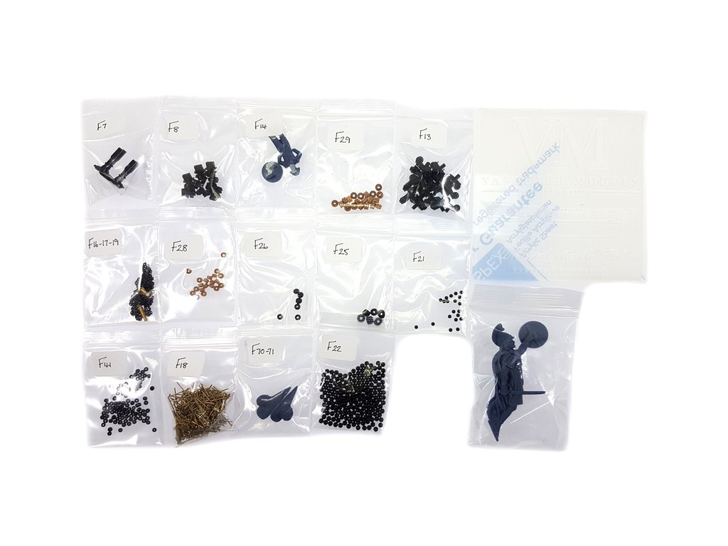 Po otevření víka krabice naleznete dřevěné díly modelu z překližky, lišty, drobné součásti uzavřené v sáčcích, mosazné lepty, díly z resinu, sadu výkresů a manuál.