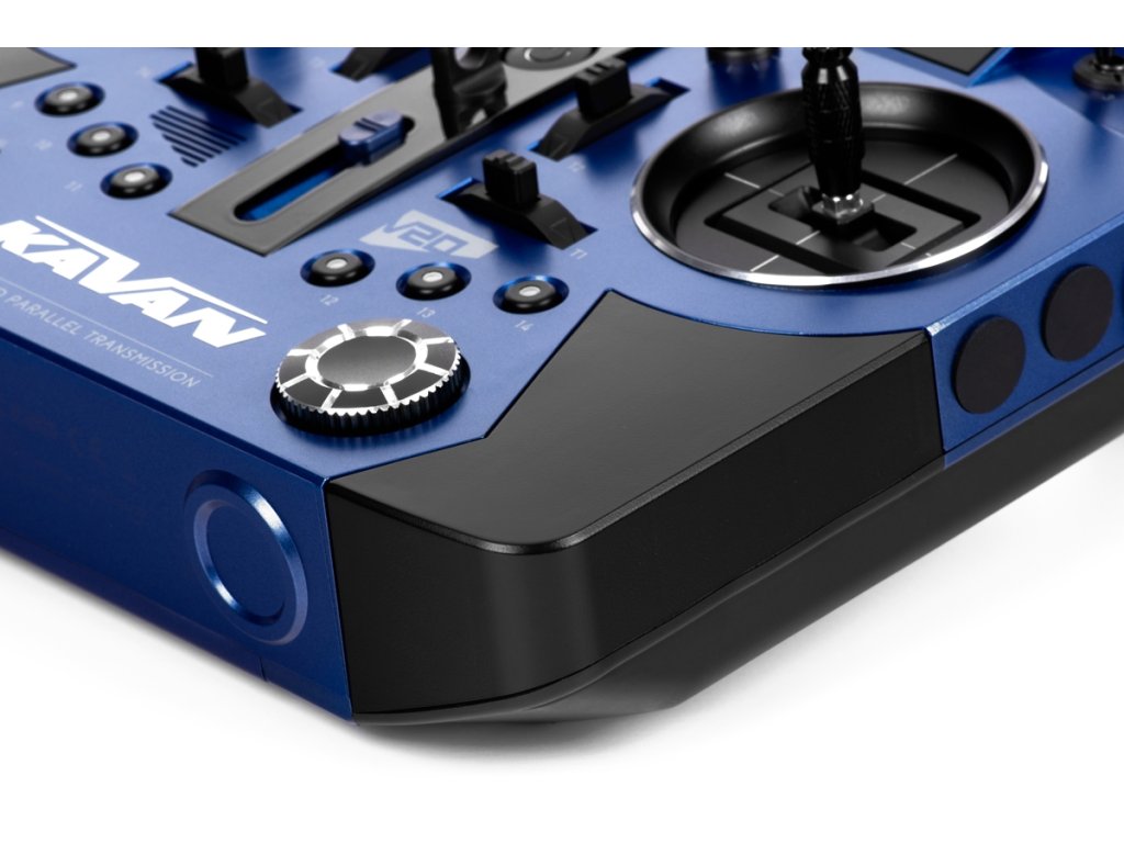Pro ovládání dalších funkcí slouží 6 třípolohových přepínačů, 2 dvoupolohové (1 momentový) přepínače, 2 postranní otočné ovladače, 6 uživatelsky programovatelných tlačítek (vpředu) a dvě momentová tlačítka (vzadu). Vestavěný 6osý gyroskopický senzor lze nastavit pro ovládání kanálu plynu, řízení výchylek mixu a slouží i pro probuzení displeje. Páčky trimů a knoflíky jsou celokovové, precizně obráběné na CNC. Návrh rozmístění ovladačů a ergonomie těla je výsledkem několika desítek hodin testování a ladění týmem KAVAN.
