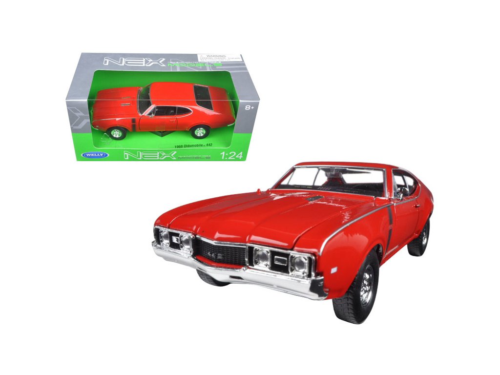 Welly - Oldsmobile(1968) model 1:34 červené Auto v měřítku 1:34 vyrobené z kovových a plastových dílů. Baleno v papírové krabičce s fóliovým průhledem. Otevírací dveře. Přišroubováno na papírovém podstavci s popisem typu. Délka autíčka 12 cmDoplňkové parametry