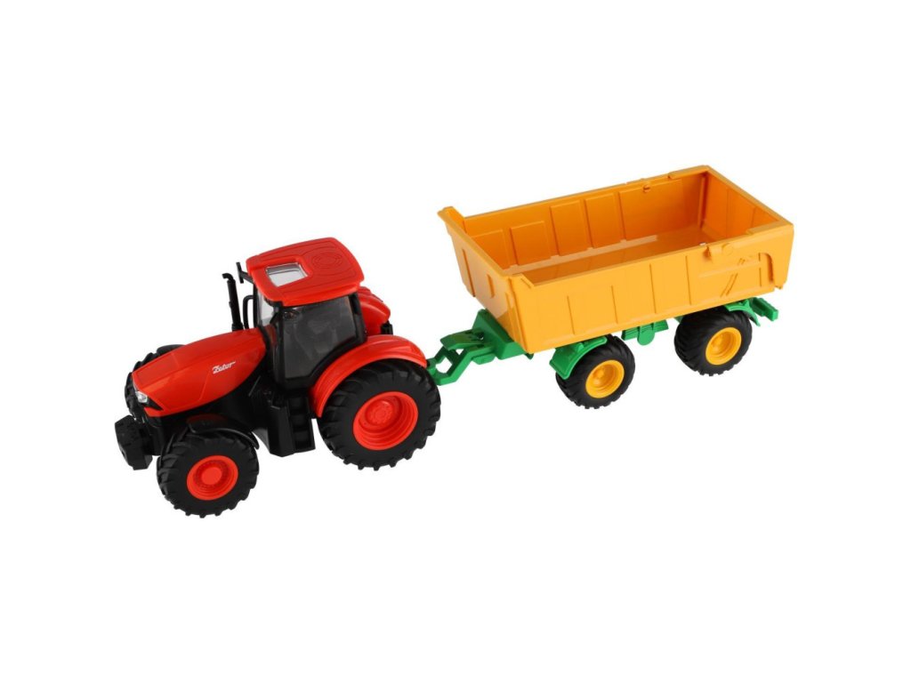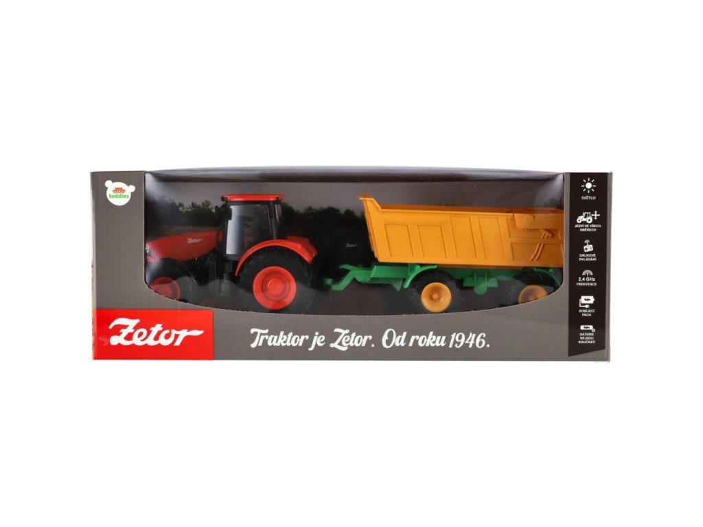 Krásný model zemědělského traktoru Zetor s dlouholetou tradicí, kterou musí milovat snad každý. Vyražte na pole s pořádným traktorem se světlem a zvukem! Traktor s valníkem je nepostradatelný pomocník pro každého malého farmáře! Valník můžeš jednoduše odpojit a traktor využít k dalším pracím. Traktor jezdí na dálkové ovládání ve všech směrech na frekvenci 2,4 GHz. Zmáčknutím tlačítek traktor vydává reálné zvuky a svítí mu světla. Hračka je na baterie 2x AAA do ovladače a na dobíjecí pack, které jsou součástí balení. Velkost traktoru s valníkem: 42 cm Vhodné pro děti od 3 let